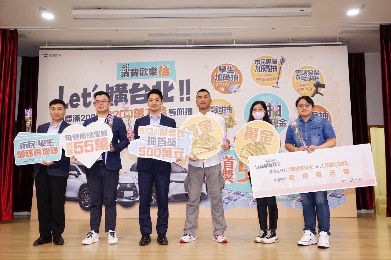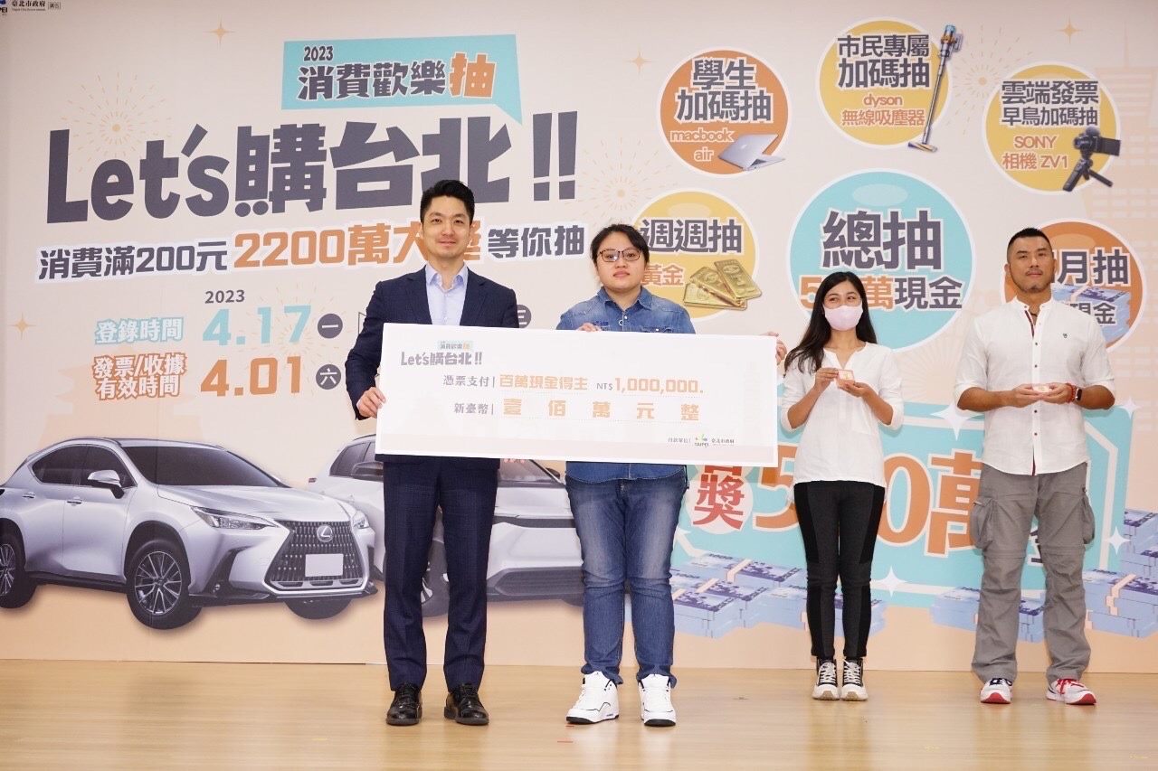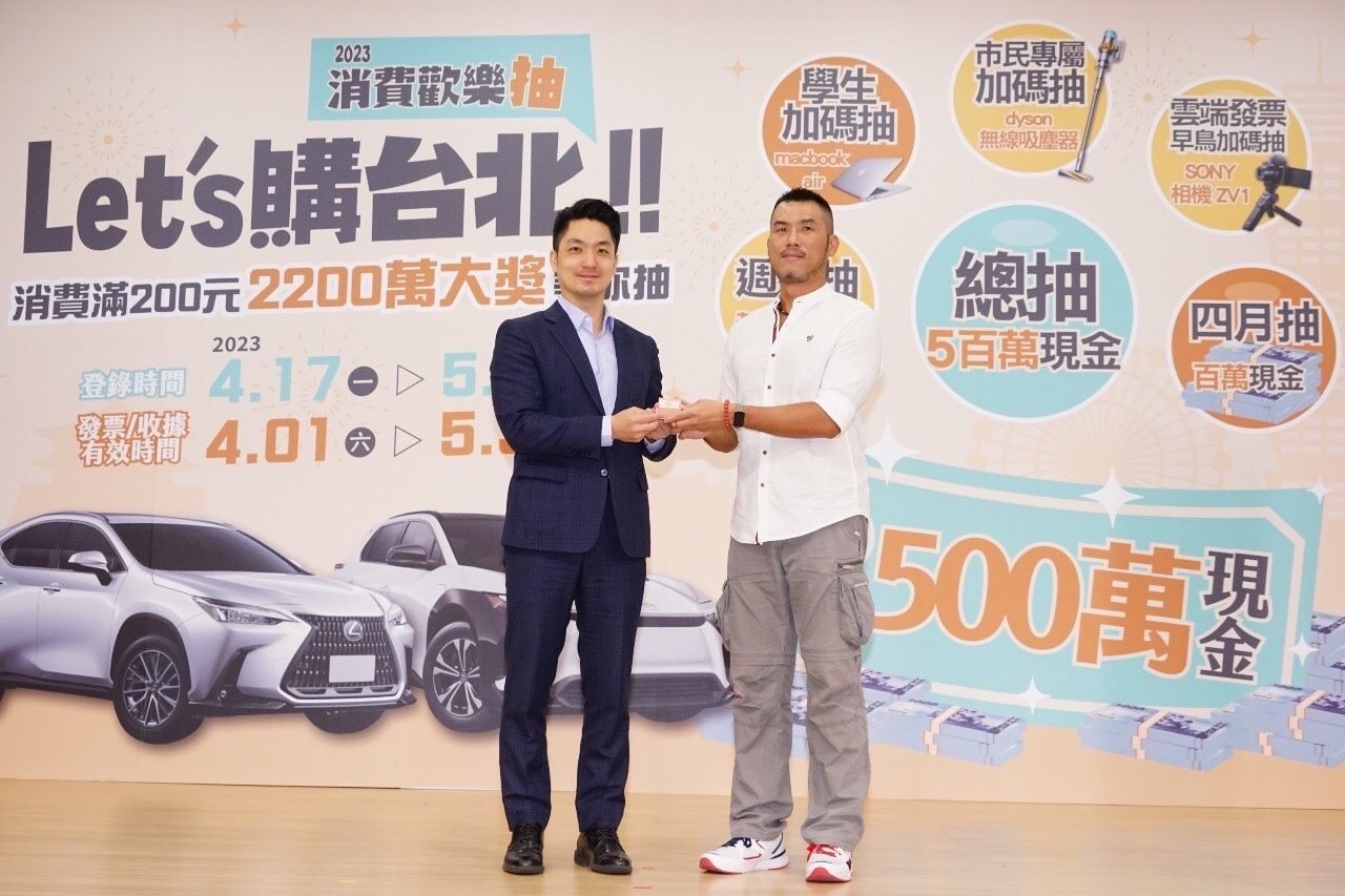 臺北市舉辦「2023 Let's購臺北 消費歡樂抽」活動,已於5月3日抽出首次大獎,臺北市長蔣萬安今(11)日特別將百萬現金大獎與黃金1兩頒發給中獎的幸運民眾,並於會上分享(1)申請雲端發票資訊不漏KEY、(2)友好特店消費2倍中獎機會、(3)臺北市民、學生專屬再加碼等3大中獎攻略,就有機會成為最大獎500萬得主。