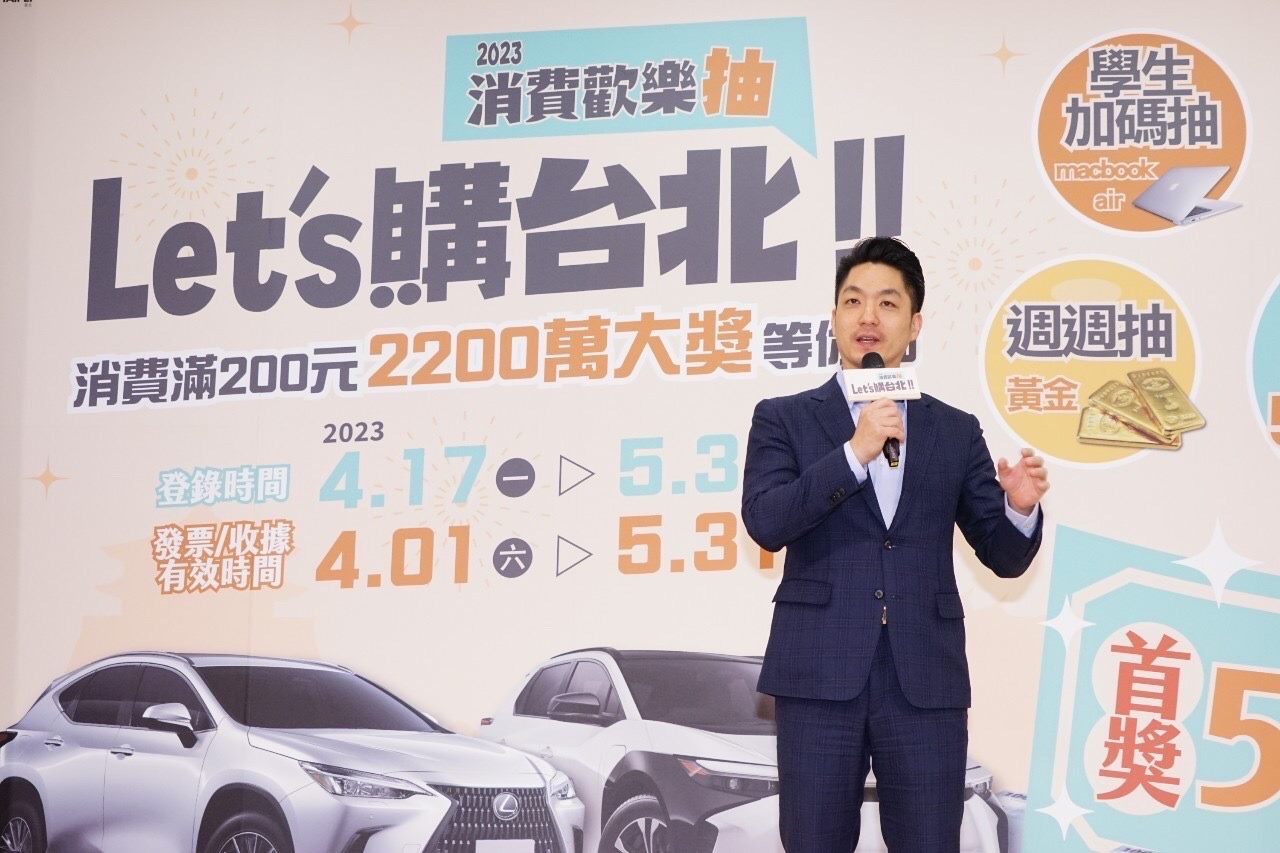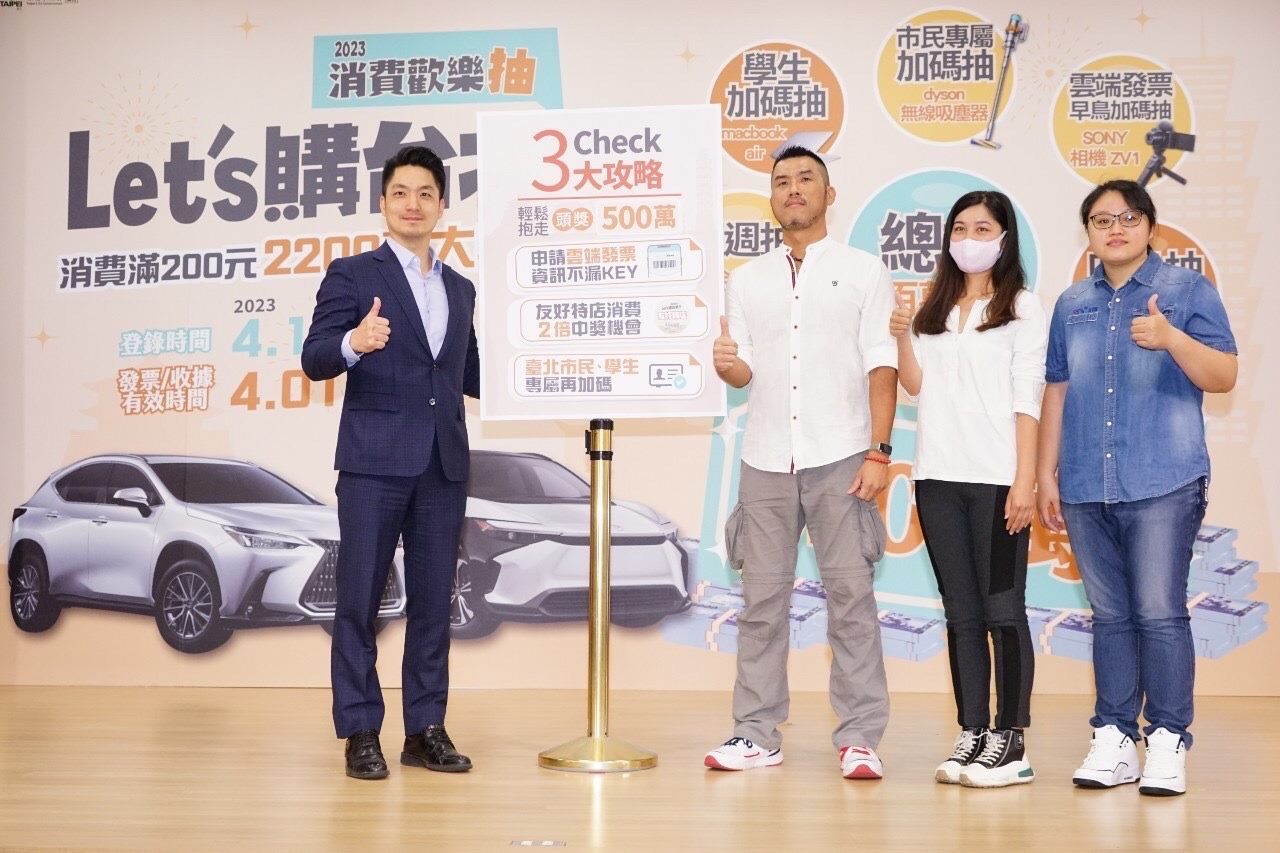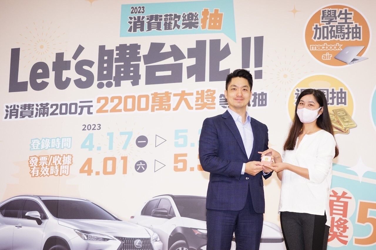 「2023 Let's購臺北 消費歡樂抽」活動倒數不到3週,民眾持有112年4月1日至5月31日在臺北市店家消費發票或收據,單筆消費每滿200元,至活動官網登錄即可產生1組抽獎序號、每組抽獎序號有1次中獎機會,於特約店家消費更可獲得2次抽獎機會。週週抽黃金、學生加碼抽Apple系列、市民專屬加碼抽Dyson無線吸塵器、Panasonic除濕機等家電好禮、壓軸總抽更有現金500萬元及Lexus油電車等,活動接下來還有超過900項好禮,歡迎各縣市民眾踴躍到臺北遊玩,一邊消費,一邊參與抽獎。